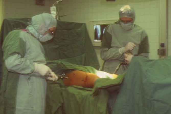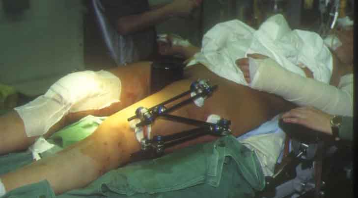sofortige Stabilisierung beider Oberschenkel mit Fixateur Hoffmann 2.