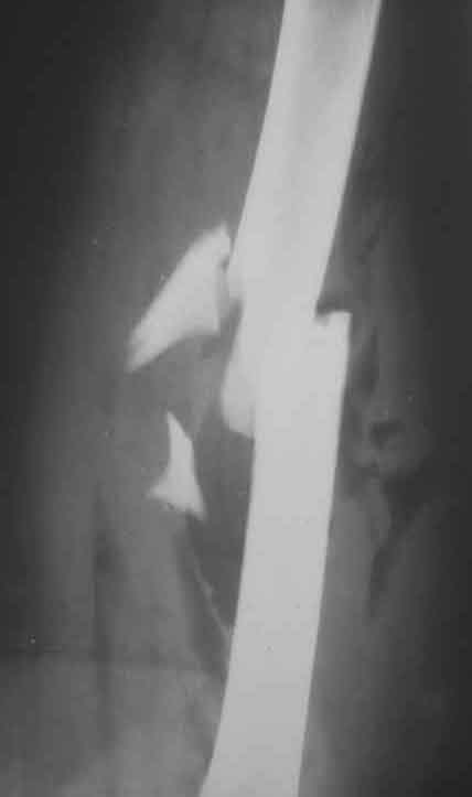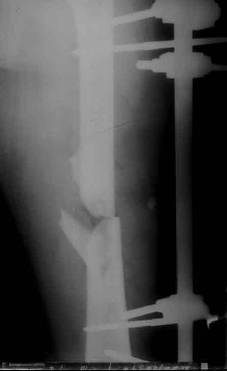 Rö.Bild vor und nach der Stabilisierung mit Hoffmann 2 Fixateur in der "free Pin-.placement" Technik.