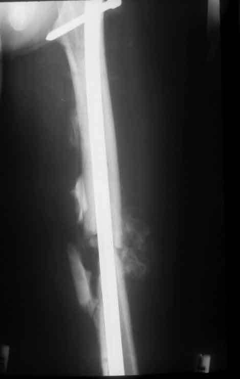 Stabilisierung mit V-Nagel nach Besserung des Allgemeinzustandes am 12. postoperativen Tag.