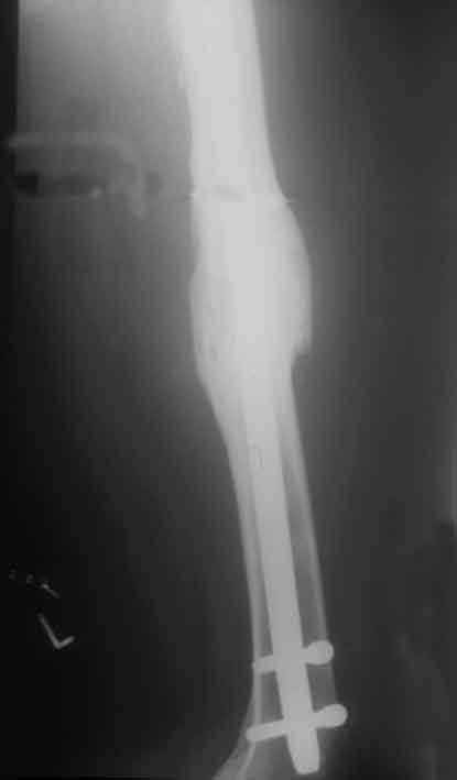 Achsengerecht verheilte Fraktur ein Jahr nach dem Unfall mit gutem Callus als Zeichen dynamischer Frakturheilung.