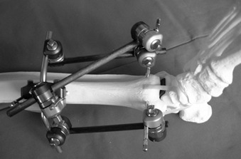 Fixateur in der Technik der freien Pinplazierung montieren. Die gelenküberbrückung