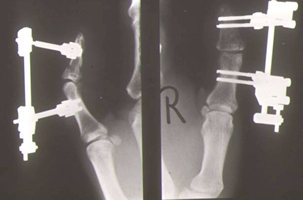 gelenküberbrückende Stabilisierung mit einem Minifixateur.