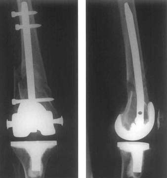 Trümmerfraktur oberhalb einer liegenden KnieTEP bei ausgeprägter Osteoporose.