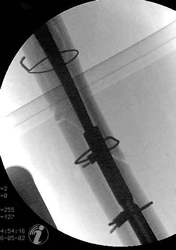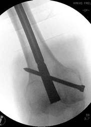 Nagel wurde durch das Knie hindurch eingebracht. Distal wurde der Nagel